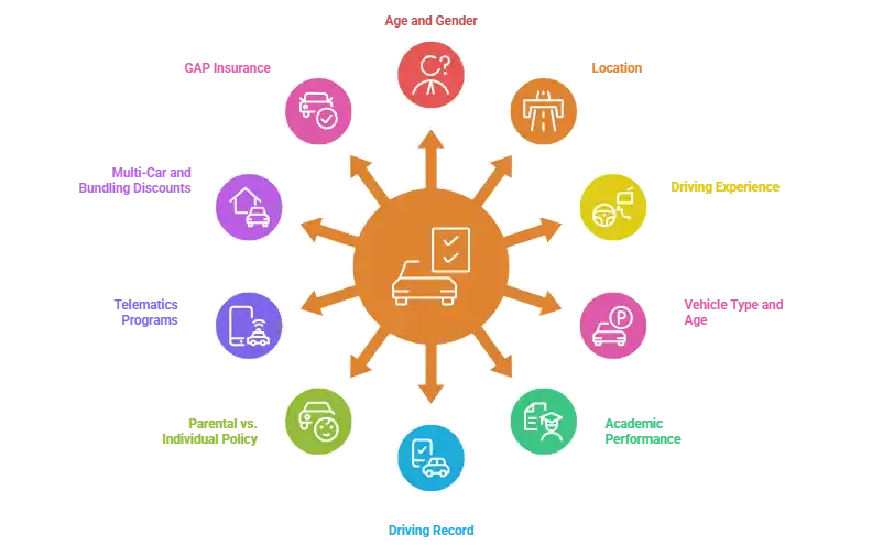 Several personal and vehicle-related factors influence how much a young driver pays for insurance.