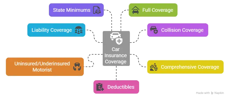 - Liability coverage: Required in most states to cover bodily injury and property damage to others.